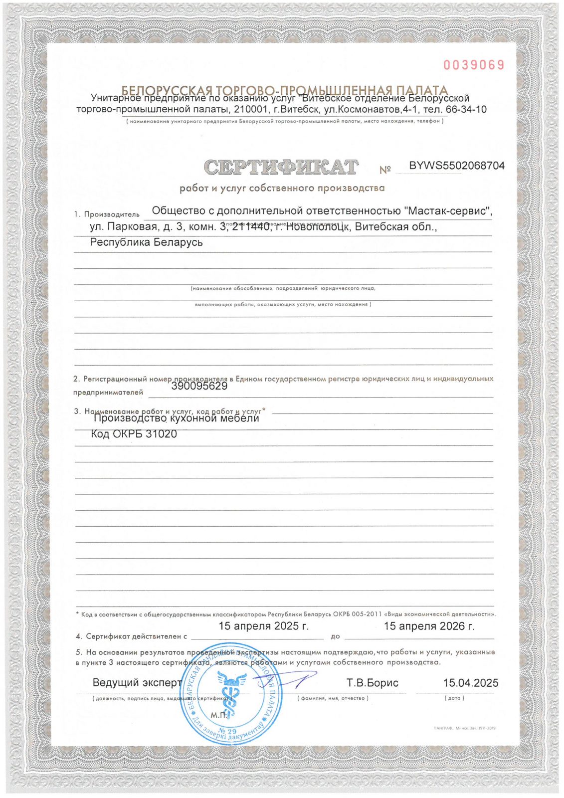 Сертификат на производство кухонной мебели