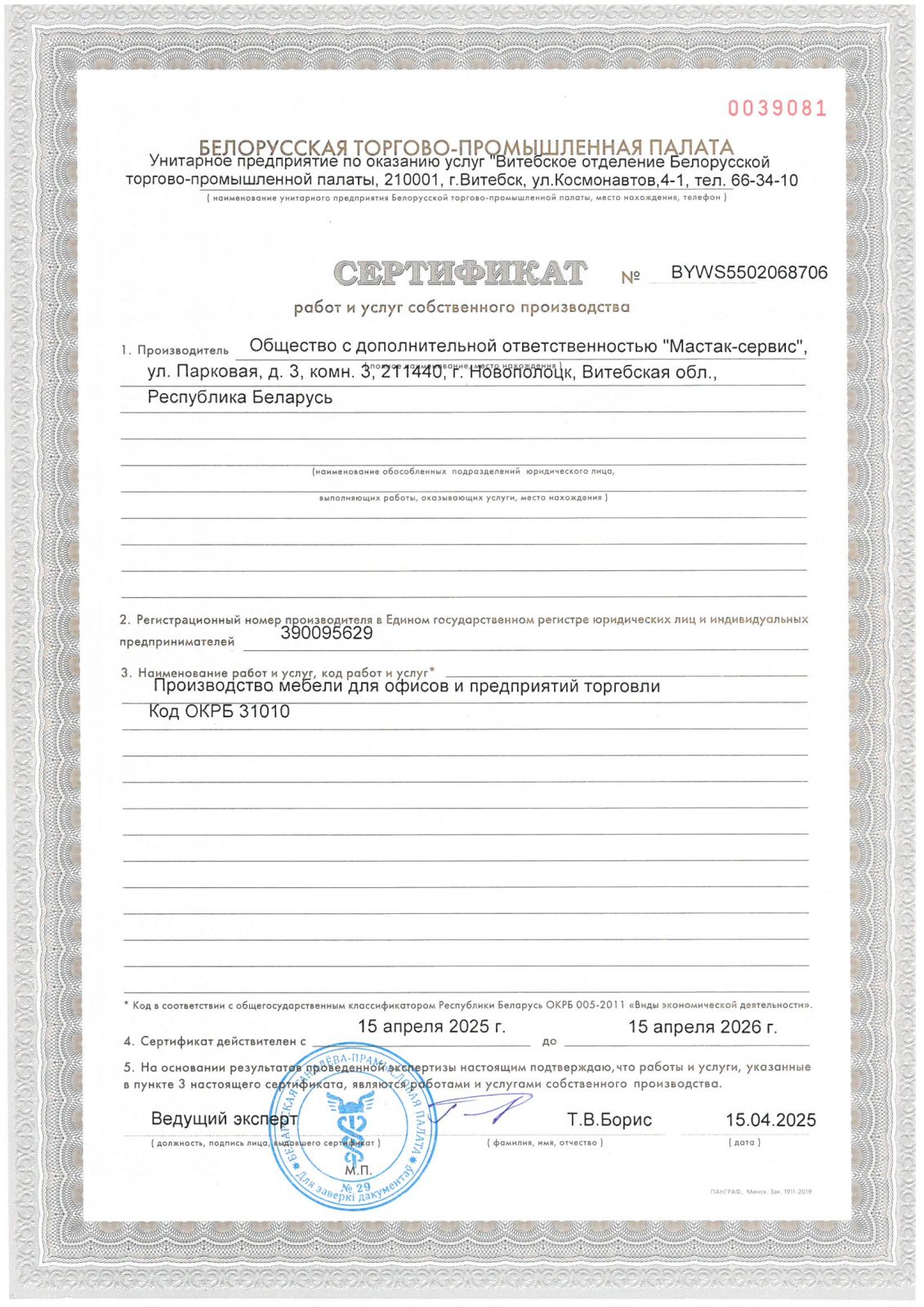 Сертификат на производство мебели для офисов и предприятий торговли