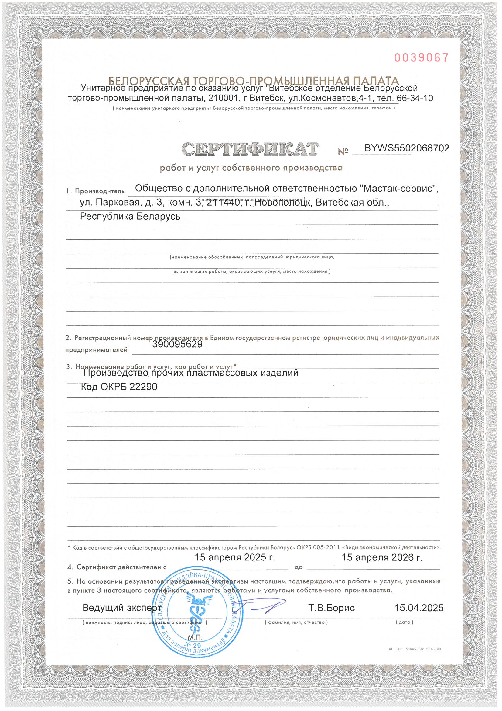 Сертификат на производство прочих пластмассовых изделий