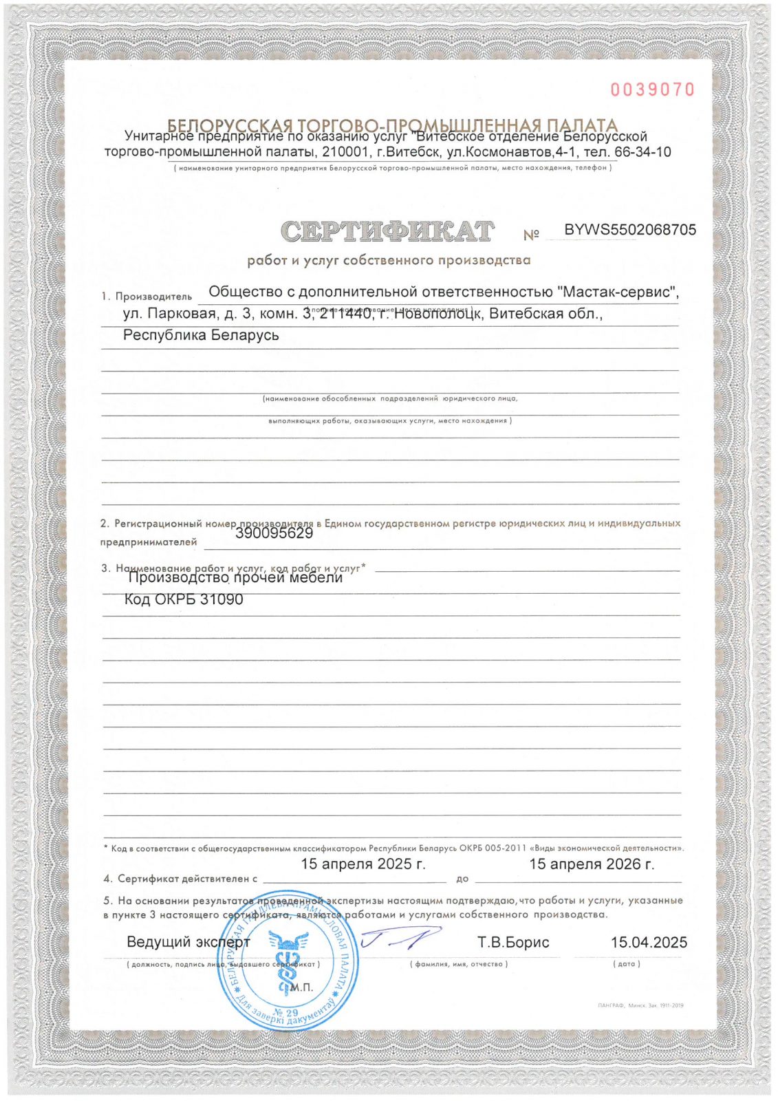 Сертификат на производство прочей мебели